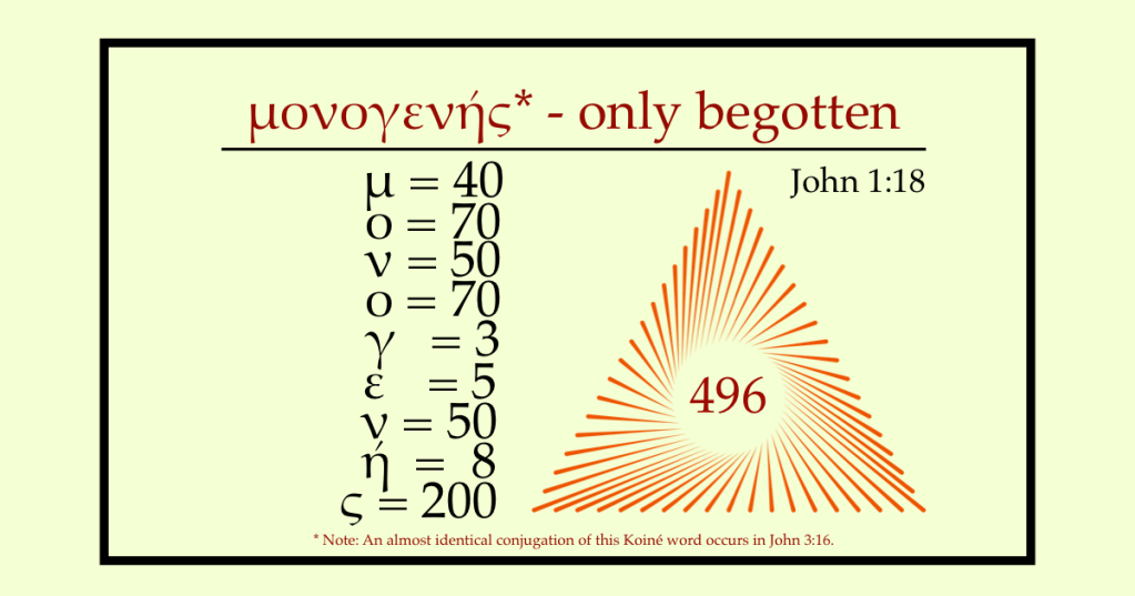 But what about the triangular numbers mentioned previously? One of the interesting things about many ancient languages is that their letters doubled as numbers. Consequently, any word or name becomes an equation. In Koiné Greek, the word μονογενής can be added up, resulting in the sum 496. So what? Aside from the fact that 496 is a triangular number (and a perfect number — look it up), it also happens to be the number of syllables in the Prologue to the Gospel of John. Who says so? The late professor Maarten J.J. Menken says so, in his 1985 dissertation publication entitled Numerical Literary Techniques in John: The Fourth Evangelist’s Use of Numbers of Words and Syllables.
