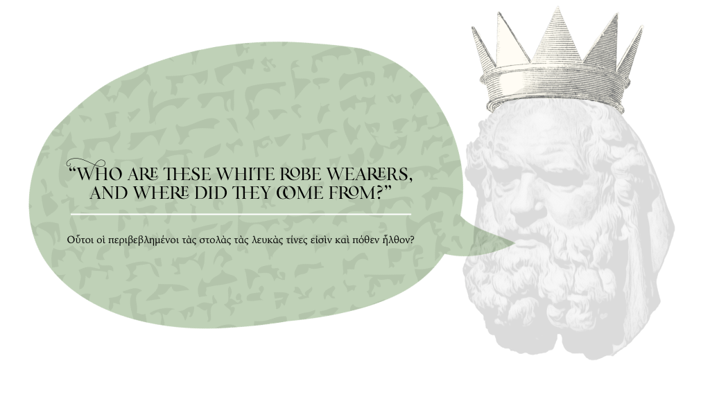 In the first verse of the chapter, the Sacrificial Lamb breaks open the first seal of some sort of historically significant scroll. Upon being summoned thunderously by one of four heavenly cherubim (that is, one of the Living Creatures) to “Come!” the first of four horseman appears, mounted upon a white horse. He, the unidentified first horseman, holds an archer’s bow, and somehow a crown is given to him. And the verse abruptly concludes with, “He went forth conquering and to conquer.”